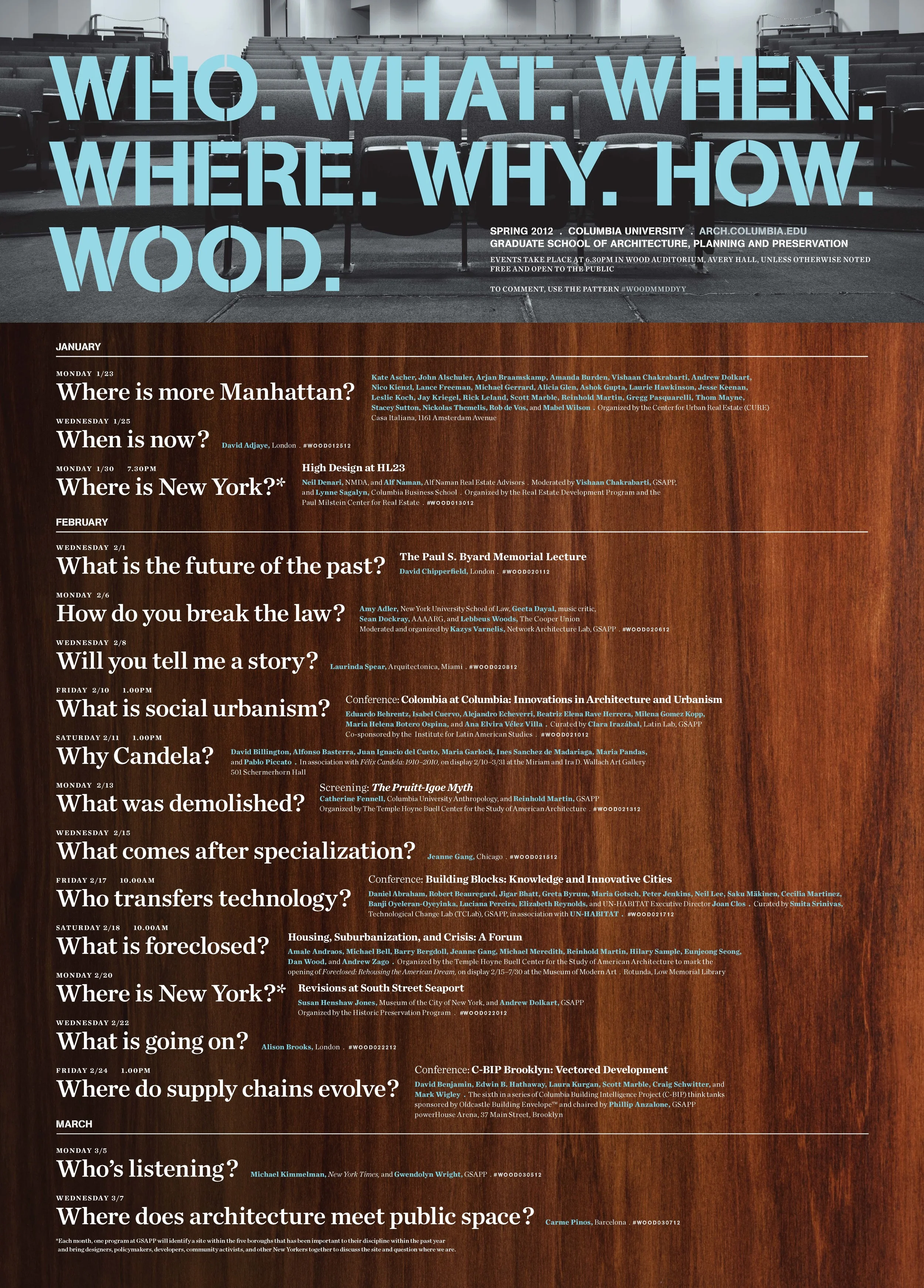 GB: Never getting bored. The range of speakers and subject matter is really diverse, and that’s thanks to guidance from Dean Mark Wigley and the GSAPP faculty. This semester, I’m looking forward to a panel on imagery and copyright; conferences on Colombian urbanism, Lewis Mumford, and technology transfer; a conversation on environmental health between Helen Caldicott and Kate Orff; events from the Buell Center for the Study of American Architecture around the MoMA exhibition Foreclosed: Rehousing the American Dream; think tanks on the future of the building industry in Brooklyn and Toronto; and appearances by Odile Decq, Carme Pinós, Arquitectonica, Teddy Cruz, and David Chipperfield in memory of Paul S. Byard, to name just a few.