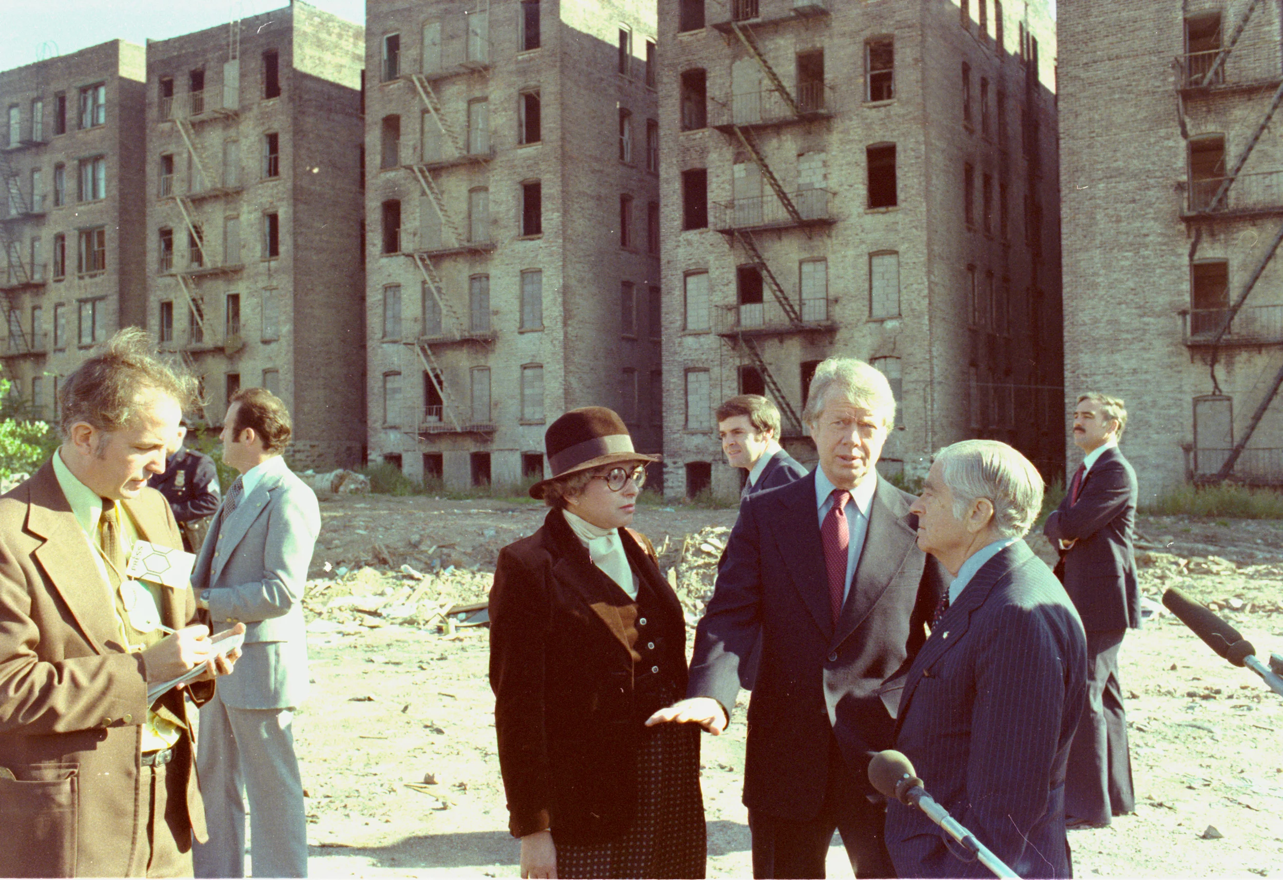 President Carter's visit to this bleak landscape was a break from the past. Covering the event, the New York Times noted: "no one could recall when Mr. Carter, or any other President had visited an area like the South Bronx."[2] The wreckage he toured that day was not specific to one crisis in particular, but rather to the ongoing crisis of being poor in America. Opportunities blockaded by monolithic highways and housing projects, residents had seen once-stately neighborhoods suffer what urban epidemiologists Deborah and Rodrick Wallace call a "contagious fire epidemic" that coincided with municipal cuts to fire departments, and to federal urban renewal funds under Richard Nixon.